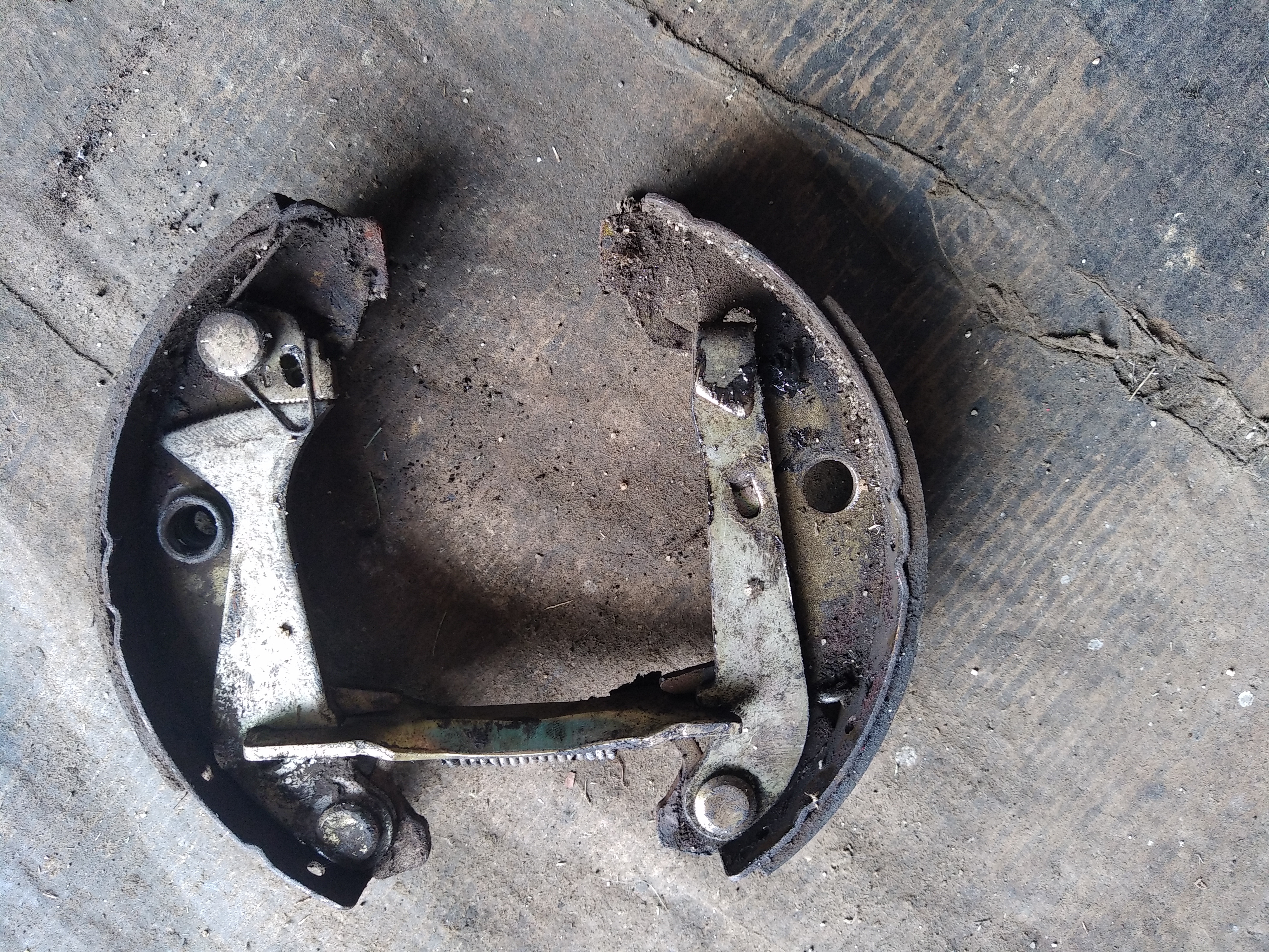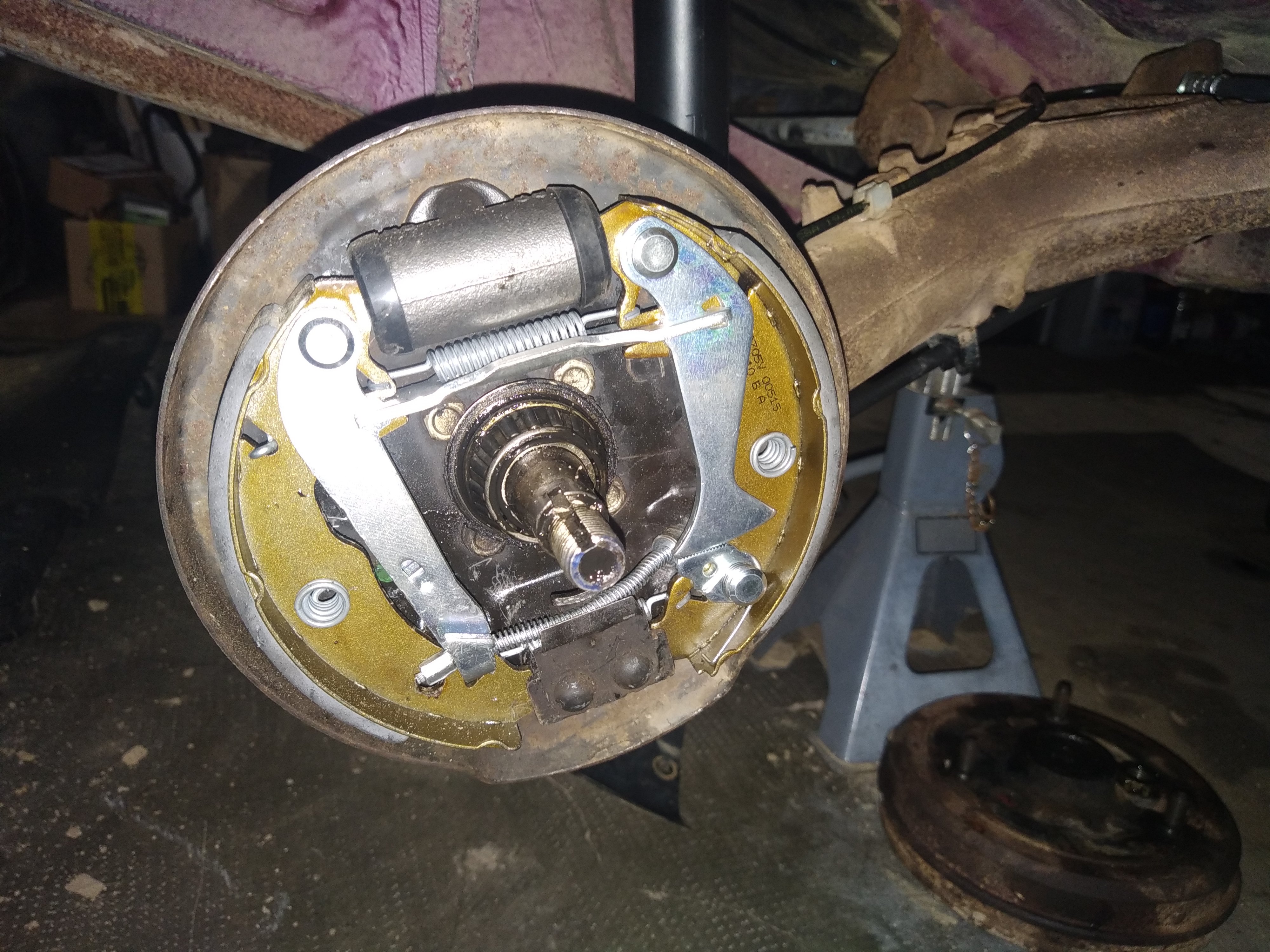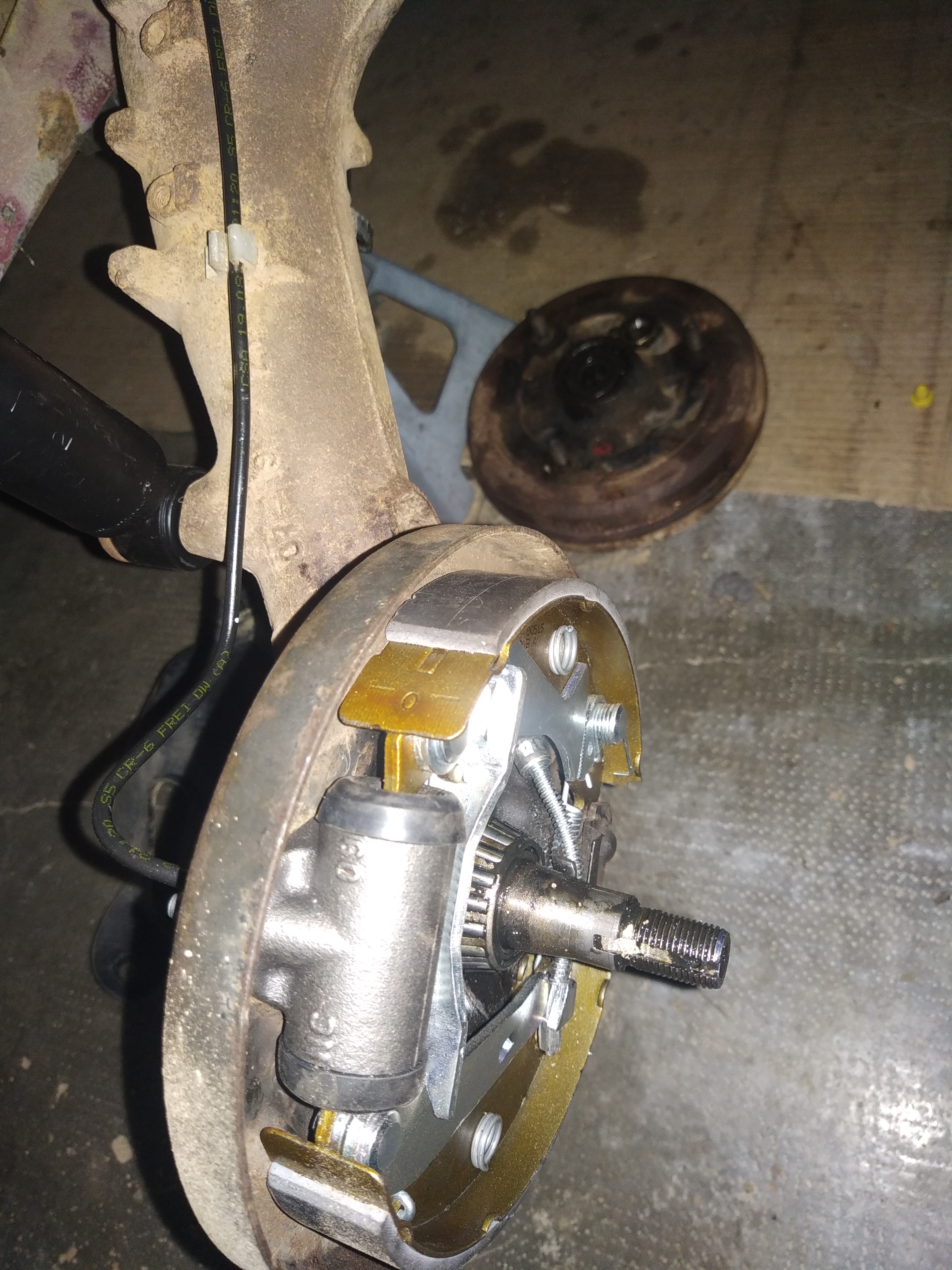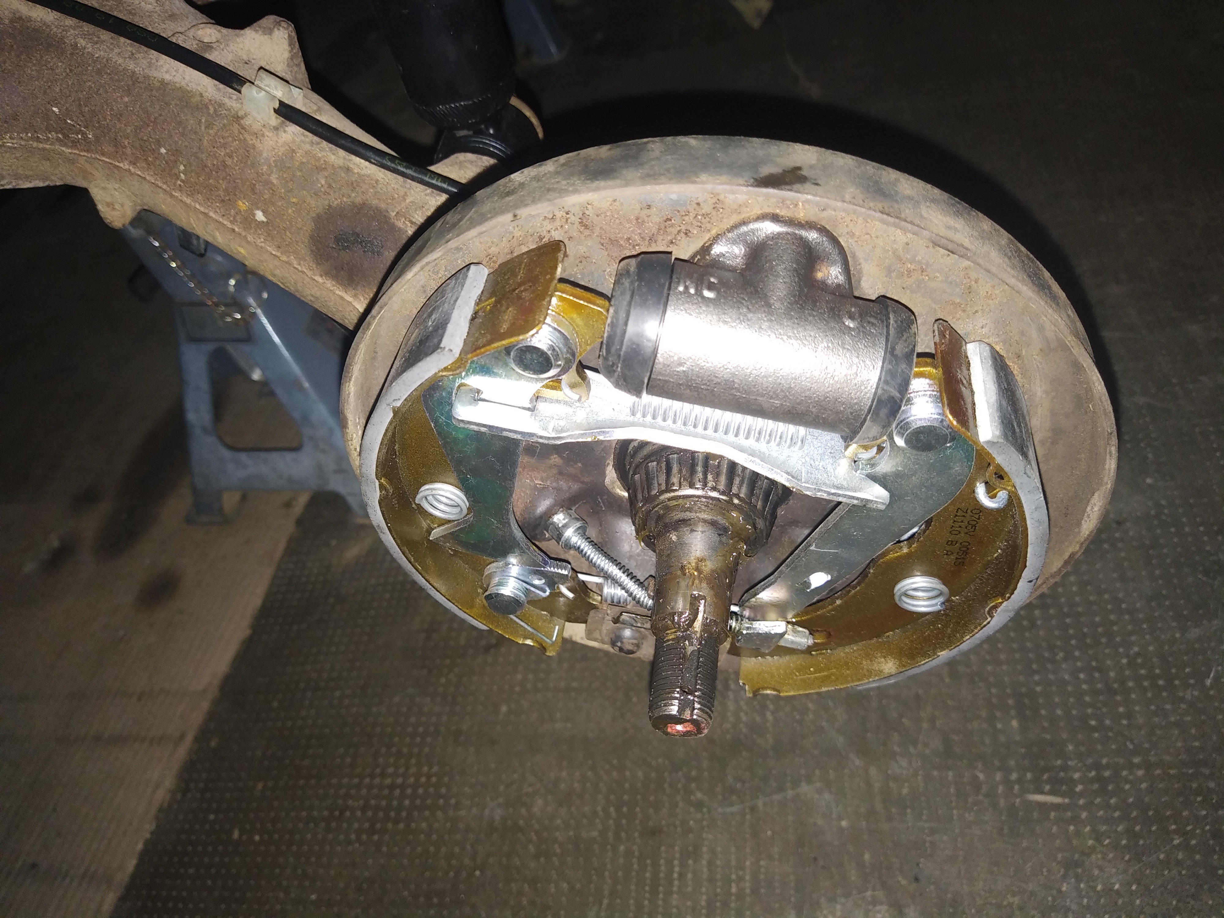 Les systèmes de freinage ont été remis à neuf. Lors de la remise en place des tambours, les nouveaux câbles de frein à main étant moins détendus généraient une tension sur les mâchoires.